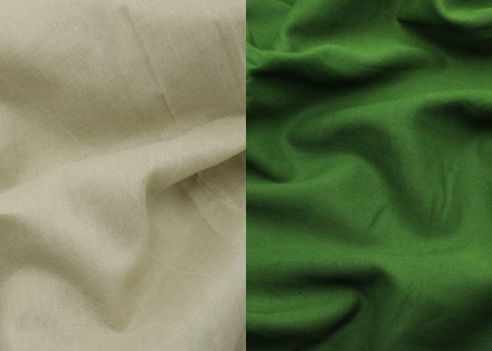 Close-up of beige fabric on the left and green fabric on the right.