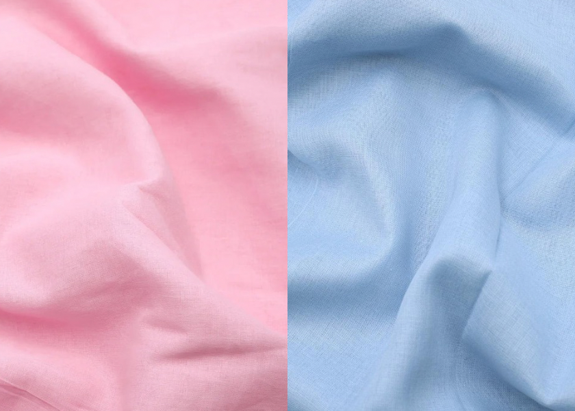 Two swatches of fabric, one pink and one blue, side by side.