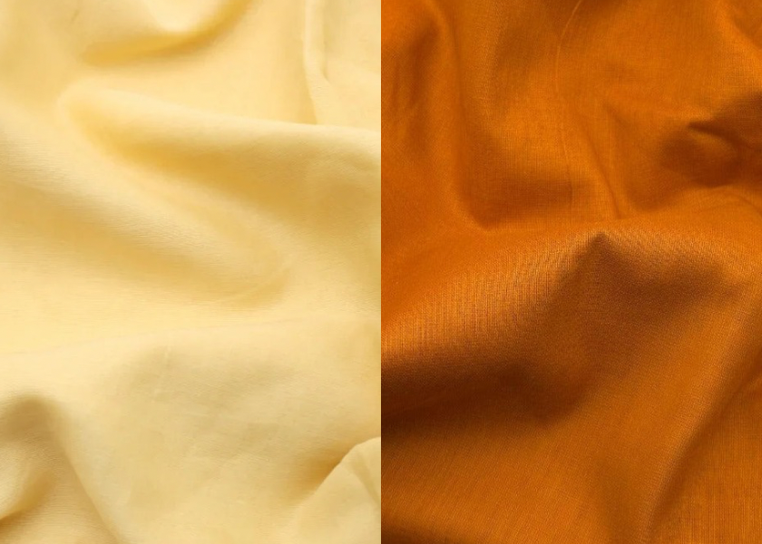 Two fabric swatches, one beige and one orange-brown, side by side.